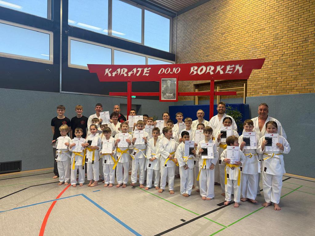 (Text/Bilder MV) Borken, 14. Dezember 2024 Am vergangenen Samstag fand eine kleine Gürtel-Prüfung statt. Geprüft wurden knapp 30 Teilnehmer, die im Sommer entweder krank oder von ihren Fähigkeiten noch nicht so weit waren. Die Prüflinge zeigten sehr gute Leistungen und erhielten somit ihren nächsten Farbgurt, was letztendlich nur eine Etappe auf dem langen Weg zum Ziel des Schwarzgurt ist. Im Namen aller Vereinskameraden gratulieren wir den Prüflingen! Weiter so