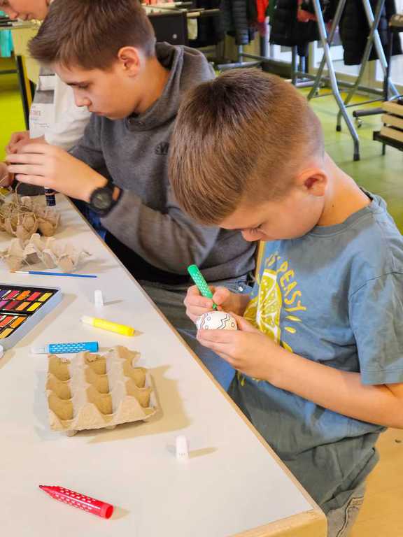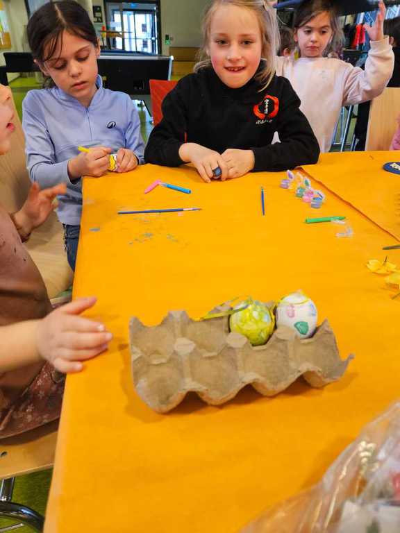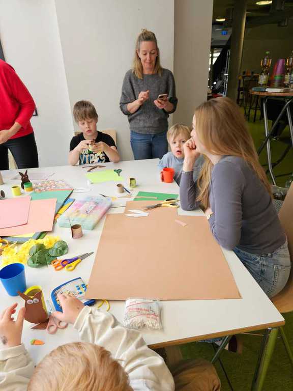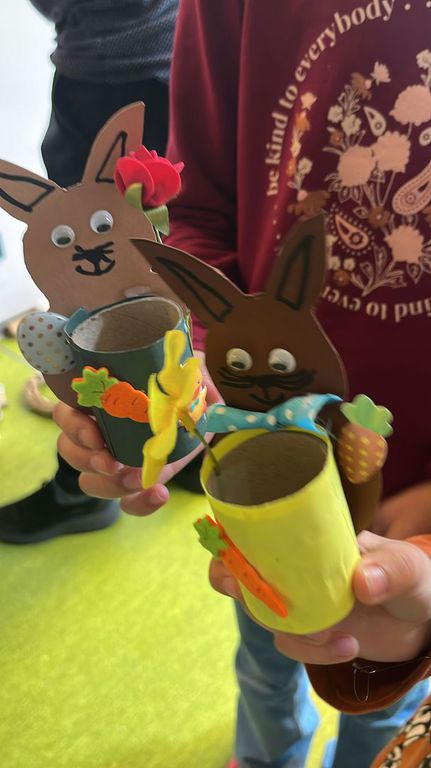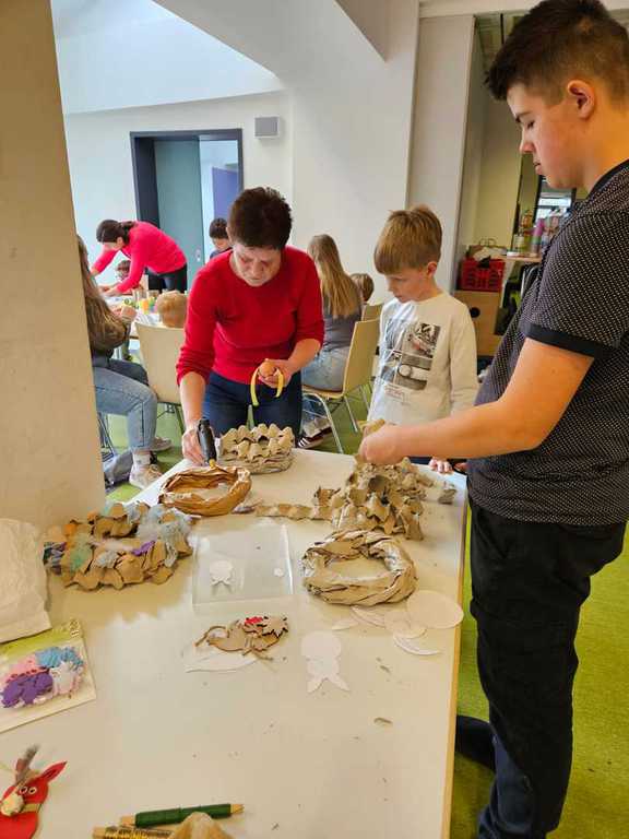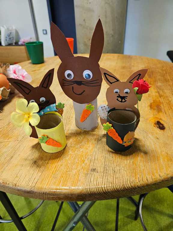 Dank eines großen Angebots an Materialien konnten die Teilnehmenden ihrer Fantasie freien Lauf lassen. Die liebevoll vorbereiteten Bastelanregungen von Jutta boten viele Ideen: Eierbecher aus Klopapierrollen, bunte Osterkränze, Mobilés, Fensterbilder aus Tonpapier, bemalte Eier mit Wasserfarben, Filzstiften und Malfarbe, kleine Häschen zum Hinstellen, Osternester mit Ostergras sowie verschiedene Holzdekorationen.